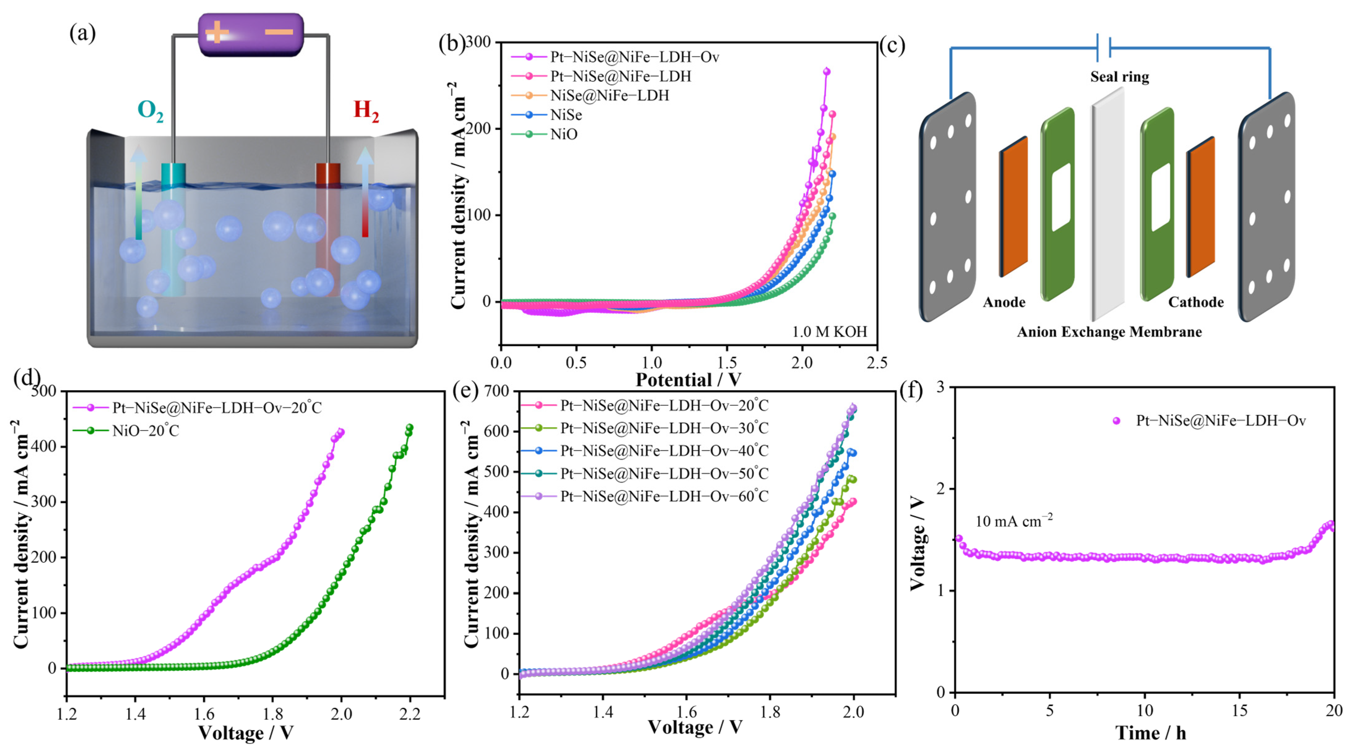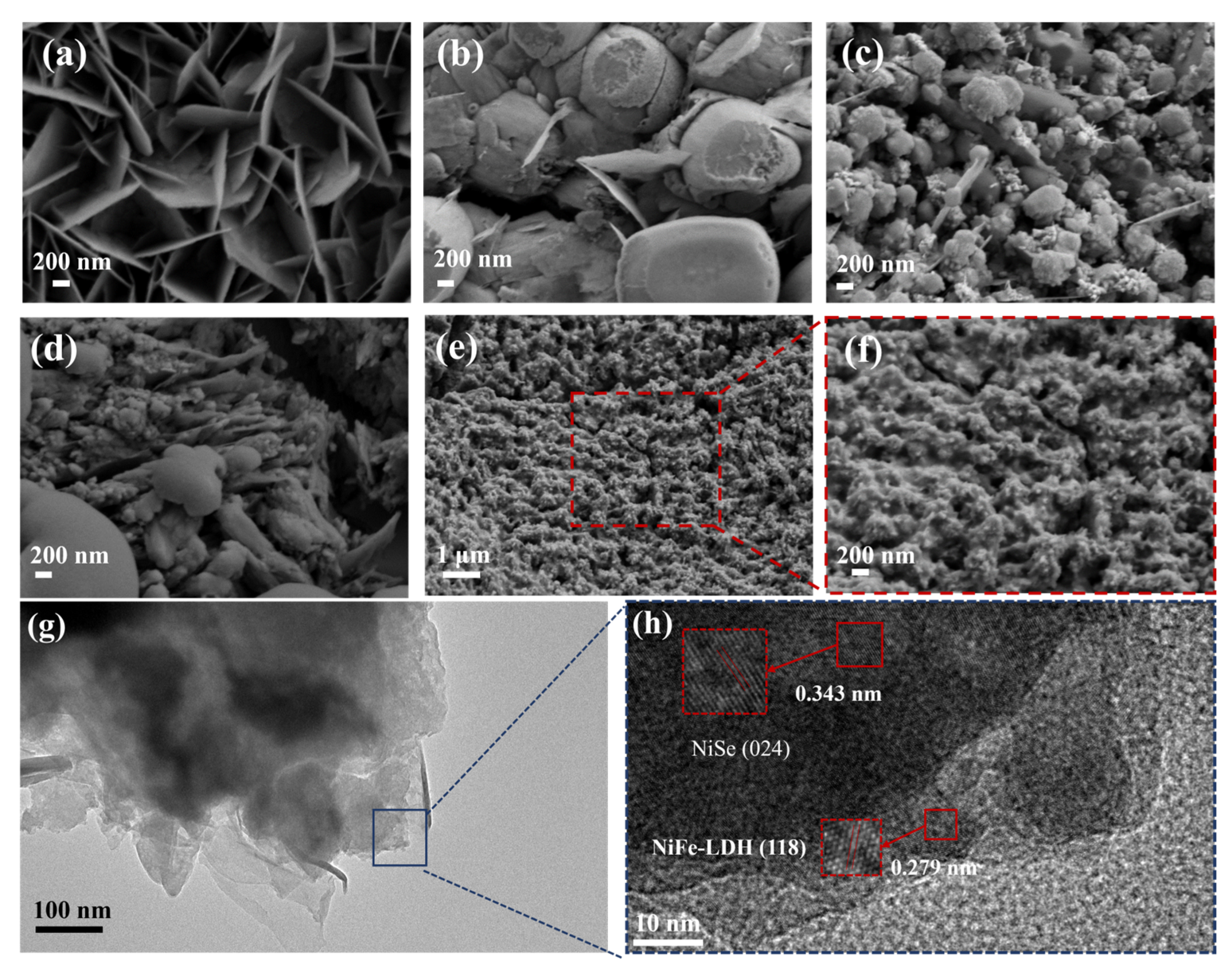 - Han, W.; Wang, W.; Liao, J.; He, Y.; Zhang, X.; Yu, C. Hierarchical FeCo LDH/NiSe heterostructure electrocatalysts with rich heterointerfaces for robust water splitting at an industrial-level current density. Inorg. Chem. Front. 2025, 12, 179–190. [Google Scholar] [CrossRef]