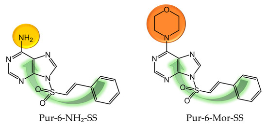 Molecular structure of Pur-6-NH2-SS ((E)-9-(styrylsulfonyl)-9H-purin-6-amine) and Pur-6-Mor-SS ((E)-6-morpholino-9-(styrylsulfonyl)-9H-purine) derivatives.