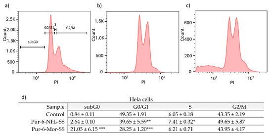 Flow cytometric analysis of the cell cycle distribution of HeLa cells exposed to 10 μM Pur-6-NH2-SS and Pur-6-Mor-SS. DNA histograms show changes in the cell cycle: (a) untreated control cells, (b) cells treated with Pur-6-NH2 -SS and (c) cells treated with Pur-6-Mor-SS. Control-derived gates were applied uniformly across all treatments. (d) Data are presented as percentage (%) of cells in the cell cycle phase. Statistically significant differences are labelled as follows: *** p < 0.0001; ** p = 0.003; * p = 0.002.