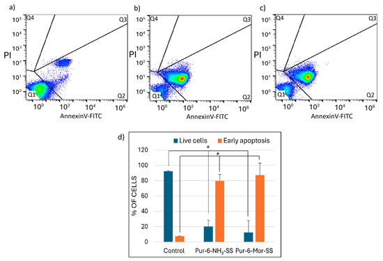 Detection of apoptosis in HeLa cells induced by 10 μM Pur-6-NH2-SS and Pur-6-Mor-SS after 24 h. The flow cytometric assay distinguishes viable cells (Q1), early apoptotic cells (Q2), and late apoptotic cells (Q3) and necrotic cells (Q4) by Annexin V/propidium iodide staining. (a) Dot plot of untreated control cells, (b) dot plot of cells treated with Pur-6-NH2-SS, (c) dot plot of cells treated with Pur-6-Mor-SS, (d) diagram of live and apoptotic cells. Statistically significant differences are labelled as * p < 0.0001.