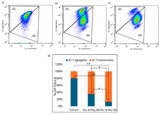 Detection of changes in mitochondrial membrane potential (ΔΨm) in HeLa cells after 24 h of treatment with 10 µM Pur-6-NH2-SS and Pur-6-Mor-SS derivatives. (a) Dot plot of control cells not treated, (b) dot plot of cells treated with Pur-6-NH2-SS, (c) dot plot of cells treated with Pur-6-Mor-SS, (d) diagram showing cells with JC-1 aggregates exhibiting red fluorescence, representing cells with intact mitochondria (Q1), and JC-1 monomers exhibiting green fluorescence, representing cells with disrupted mitochondria (Q2). Statistically significant differences are labelled ** p < 0.0001; * p = 0.002.