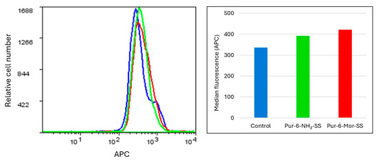 Determination of intracellular oxidative stress in HeLa cells exposed to Pur-6-NH2-SS and Pur-6-Mor-SS derivatives. The derivatives were applied at a concentration of 10 µM. The fluorescence histogram displays median values. Control (untreated) cells are shown in blue, cells treated with Pur-6-NH2-SS in green, and cells treated with Pur-6-Mor-SS in red.