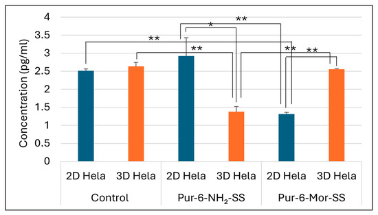 The concentration of carbonic anhydrase IX (CA IX) was determined by ELISA in the supernatant of HeLa cells grown in 2D and 3D cultures. The selected Pur-6-NH2-SS and Pur-6-Mor-SS derivatives showed different effects on CA IX concentration depending on the type of cell culture (Figure 6). In untreated control cells, no significant difference in CA IX concentration was observed between 2D and 3D cultures. Treatment with the Pur-6-NH2-SS derivative led to a slight increase in CA IX concentration in the 2D culture, with a measured value of 2.9 ± 0.5 pg/mL compared to the control. In contrast, a decrease in CA IX concentration of about 50%, to a value of 1.3 ± 0.1 pg/mL, was observed in the 2D culture treated with the Pur-6-Mor-SS derivative. In the 3D culture, the CA IX concentration after treatment with the Pur-6-NH2-SS derivative was 1.4 ± 0.1 pg/mL, which was lower than in the control. Treatment with the Pur-6-Mor-SS derivative did not change the CA IX concentration in spheroids compared to untreated cells.