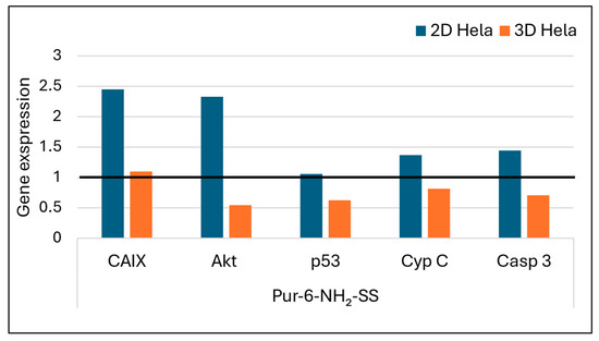 Gene expression of Akt, CAIX, p53, caspase 3, and cytochrome C after exposure to Pur-6-NH2-SS at a concentration of 5 µM in HeLa cells cultured in 2D and 3D for 24 h. Expression levels of the analysed genes were normalized to the reference gene GAPDH. Expression in control (untreated) cells is indicated by the black line.