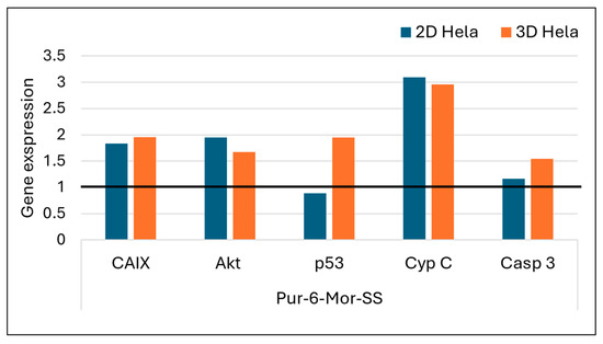 Treatment with the Pur-6-Mor-SS derivative led to increased expression of all analysed genes in the 3D HeLa cell culture. In the 2D culture, cytochrome C expression is most pronounced, while the levels of Akt and CAIX genes are nearly the same. After treatment with the Pur-6-Mor-SS derivative in the 2D culture, a slight reduction in p53 gene expression and a slight increase in caspase 3 expression were also observed.