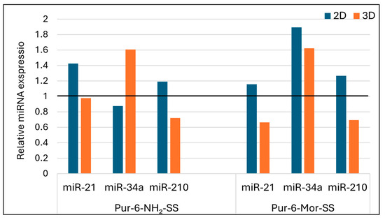 Treatment with the Pur-6-Mor-SS derivative (Figure 9) led to a slight increase in miR-21 expression in 2D cultures, while a decrease was observed in 3D spheroids. For miR-34a, elevated expression was detected in both HeLa models, regardless of culture type. miR-210 expression was upregulated in 2D cultures and downregulated in 3D spheroids, further supporting the potential role of this derivative in modulating hypoxia-related responses and mitochondrial activity.