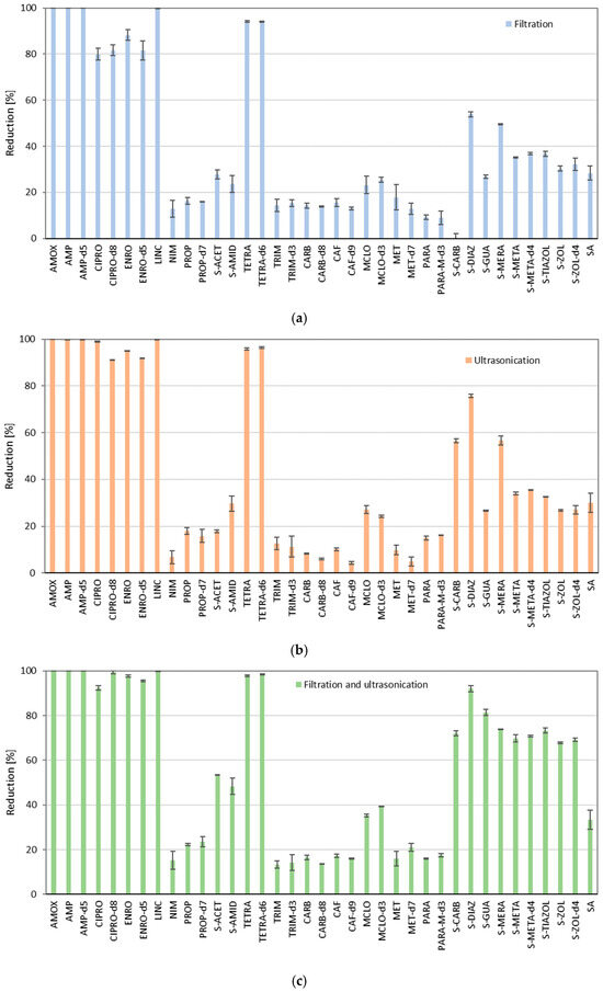 The reduction in analyte concentration during (a) filtration, (b) ultrasonication and (c) both of these operations.