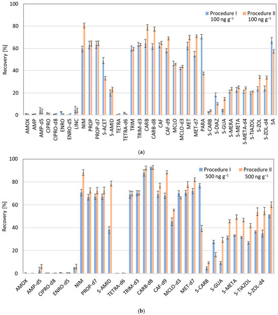 Comparison of analytes’ recovery from the experiments using dry (Procedure I) and wet soil (Procedure II) for the dose of standards 100 ng g−1 (a) and 500 ng g−1 (b).