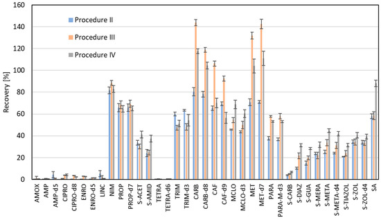 Afterwards, experiments with omission of filtration (Procedure III) and omission of ultrasonication (Procedure IV) steps were performed to study their impact on recovery efficiency. The results of these measurements are shown in Figure 3. We observed that the most significant contributions in raising analytes recovery are caused by omitting filtration for four pairs of standards and their respective ILIS: CARB and CARB-d8, CAF and CAF-d9, MET and MET-d7, PARA and PARA-M-d3. However, we must realize that this simplification of the procedure was intended to raise the recovery for the compounds, which revealed the lowest efficiency in the primary experiments. This assumption was fulfilled for four pairs of analytes (CIPRO, ENRO, TETRA and S-CARB) and their respective ILIS, which were recovered below 10% in the primary test. For CIPRO, ENRO, and their respective ILIS, the effectiveness of simplified procedures increased about 10 times. The effectiveness of TETRA extraction was still at a very low level in the simplified procedures, but these results were repeatable. However, the extraction of LINC was decreased due to the simplification of the procedure, while for AMOX and AMP, the recovery changes were not observed. It is worth noting that compounds from the group of derivatives of sulfanilamide (with the group of 4-aminobenzenesulfonamide) behaved similarly, with the rise in recovery effectiveness by omitting filtration and even higher recovery effectiveness by omitting both of these processes. The highest increase in recovery up to two times was observed for S-DIAZ with the omission of filtration, while omitting both filtration and ultrasonication caused a rise in the recovery efficiency up to three times.