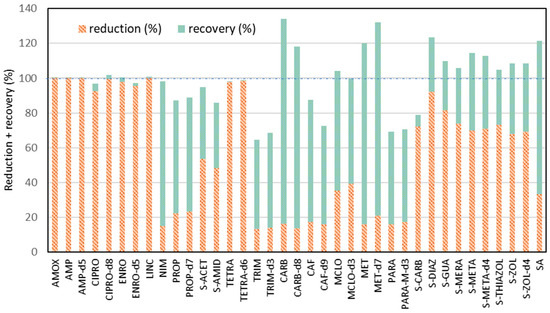 Considering the fact that some of the measured analytes are reduced significantly during ultrasonication and filtration processes, it turns out that it is necessary to compare the final efficiency of recovery resulting from Procedure IV with the loss of analytes resulting from the experiment of the analytes’ reduction during ultrasonication and filtration. For this purpose, a summary is prepared in Figure 4, where both values of recovery and reduction have been added into one column for each analyte. It was observed that for most of the analyzed compounds, the total values of recovery and reduction were over 95%, while for 10 compounds, this value was lower than 95%. The lowest values (approx. 65–71%) were noticed for pairs of compounds: TRIM—TRIM-d3 and PARA—PARA-M-d3.