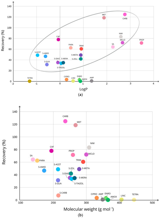 With the aim of gaining a deeper understanding of the phenomena that can cause problematic challenges resulting in significant loss of analytes during the extraction process, it was decided to interpret deeper based on their chemical properties. Therefore, a summary of the basic values, including molecular weight, pKa, LogP and water solubility, is summarized in Table S3. To better illustrate the dependencies between experimental recovery for 25 target compounds and the corresponding LogP values, the plot of this relation is prepared (Figure 6a). The higher value of LogP should indicate the easier sorption capacity on hydrophobic surfaces; therefore, we expected the following relation: the higher LogP value is connected with the higher recovery value [58]. We observed that the experimental data obtained for some compounds deviated considerably from this assumption, and similarly, as in previous studies, some deviations occurred [59]. This deviation was observed for compounds with the lowest recovery: CIPRO, LINC, ENRO, AMOX, and AMP. On the other hand, we observed that compounds from the sulfonamide group (S-AMID, A-ACET, S-GUA, S-DIAZ, S-THIAZOL and S-MERA) behaved similarly and comparable recovery levels for them were obtained. For the compounds (MCLO, NIM, PROP, CARB, and MET) with the higher LogP, the described relation was observed, and it was favourable for the higher efficiency of the recovery (more than 70%).