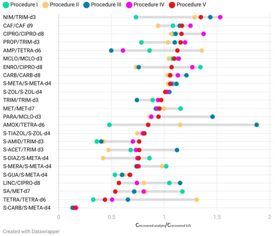 At the last stage of the presented study, the calculation of pharmaceutical concentration was performed according to the calibration curve using ILIS (spiked together with analytes before extraction). Then, the obtained concentrations were divided by the concentrations of the reference sample, which consisted of the blank solution of analytes and ILIS with the same concentration as spiked into the soil [60]. These values should be close to 1 for each analyzed compound and with each procedure. These results of the ratio Crecovered analyte/Crecovered ILIS for each analyzed pharmaceutical are summarized in Figure 7. Ratios, obtained according to the results from Procedure V, are ordered from the highest to the lowest value. In our study, these compounds, which had deuterated equivalents as ILIS and aforementioned high recovery values, e.g., MCLO, CARB, S-META, S-ZOL, TRIM and MET, were characterized by the ratio Crecovered analyte/Crecovered ILIS close to 1 and were similar for each procedure. On the other hand, these compounds, which were characterized by low efficiency of recovery, e.g., CAF, CIPRO, TETRA, despite the fact that the deuterated equivalent was taken into calculations, differentiated values were noted. The greatest variation in values was observed for TETRA, but the recovery of this compound and their deuterated equivalent was below 1%, and at this level, deviations can be explained by an error in chromatographic analysis or extraction procedure. A relatively low recovery rate may result from strong or specific sorption of TETRA to the soil samples [61]. Then we were focused on these compounds, which have no available deuterated equivalent, and similar conclusions were found, that the ratio Crecovered analyte/Crecovered ILIS can be similar and close to 1 for these compounds with a relatively high value of recovery. Although we also observed that for S-GUA and S-CARB, where S-META-d4 was used as a standard, this ratio was relatively low but repeatable for each procedure. In those cases, for the determination of the mentioned analytes in the environmental samples, compensation and superior performance of our method can be achieved by the use of predetermined recovery factors [62].