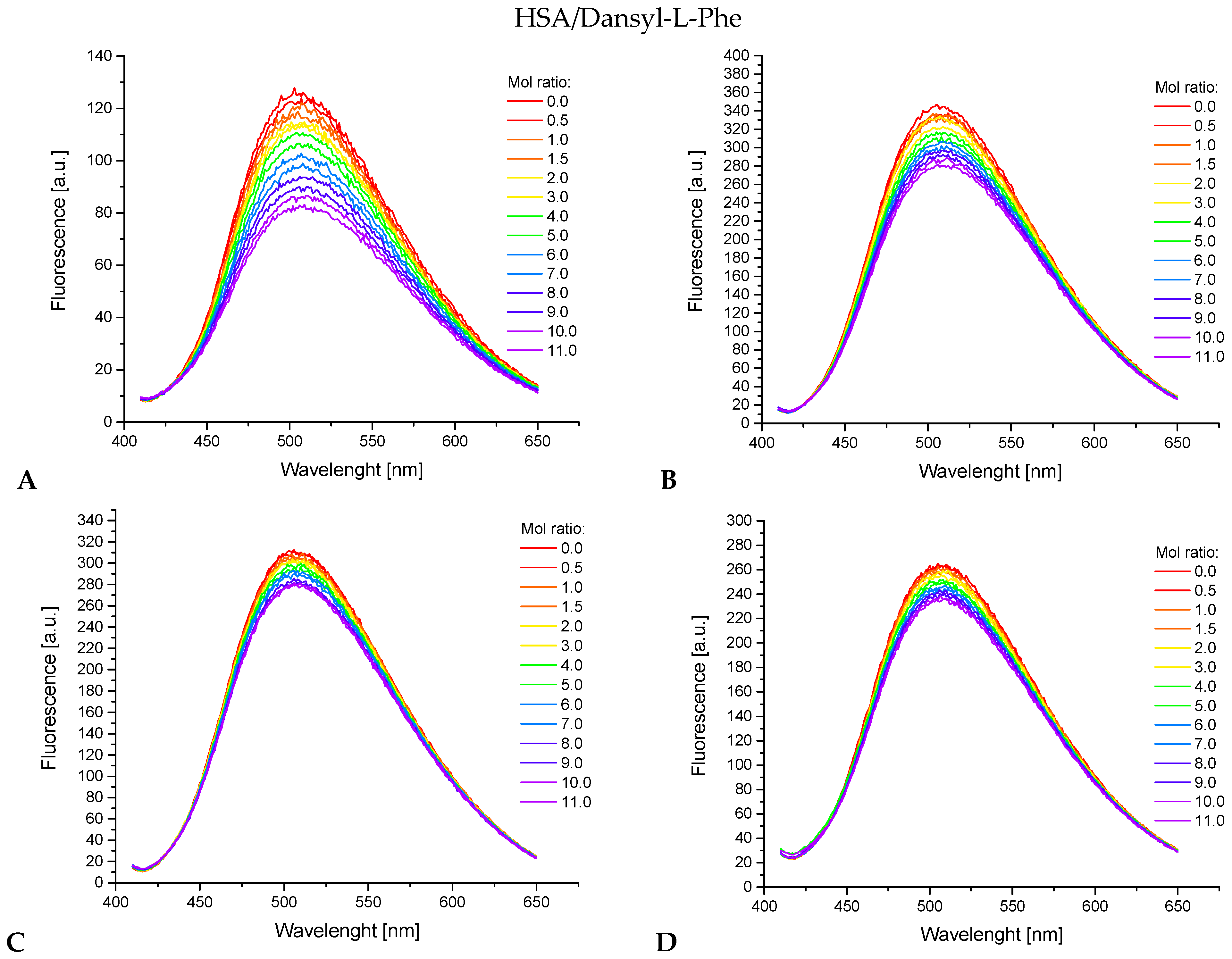 - Ryan, A.J.; Ghuman, J.; Zunszain, P.A.; Chung, C.; Curry, S. Structural Basis of Binding of Fluorescent, Site-Specific Dansylated Amino Acids to Human Serum Albumin. J. Struct. Biol. 2011, 174, 84–91. [Google Scholar] [CrossRef] [PubMed]