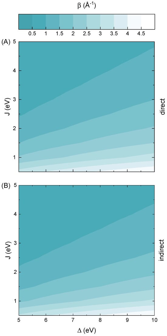 A key observation from the results presented in Figure 1 is that, within the assumed range of Hamiltonian parameters (see Equation (2)), the decay rates take values from 0.5 Å−1 or less up to nearly 5 Å−1. This wide variation indicates that the character of charge transport transitions from being weakly dependent on distance to exhibiting exponential decay with strong distance dependence. Such a shift has a significant impact on the underlying transport regime, which is indicative of a near-resonant process when decay rates are low () and suggests coherent and fully off-resonant tunneling for higher decay values [25]. Interestingly, it can also be observed that decay rates exhibit relatively little sensitivity to changes in the energy gap under weak coupling conditions and yield low values only for strong electronic coupling. This is somewhat expected, since higher electronic coupling should promote more efficient charge transport, as suggested by the stronger overlap of orbitals. However, this behavior stands in partial contrast to the preliminary argument by Brookes, which suggests that tunneling across an odorant molecule would be ineffective mainly due to the large energy gap characteristic of such molecules [26]. In fact, the calculated decay rates at the midpoint value of electronic coupling become relatively efficient for transport to occur and only improve as the coupling increases. Moreover, these findings are mostly uniform, whether the direct or indirect process is considered. Only some small improvements in decay rate values are present in terms of the indirect tunneling, but rather in the strong coupling limit.