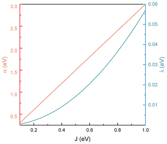 In Figure 2, the behavior of the linear electron–phonon interaction and reorganization energy as a function of the electronic coupling is presented. Note that only eV is considered, in agreement with the earlier condition for strongly localized HOMO and LUMO. In general, both discussed terms are clearly increasing along with the increase in the electronic coupling, although they do so in qualitatively distinct ways. The electron–phonon coupling exhibits linear strengthening, which is in line with the earlier observations made for carbon systems [35,36] and reflects the exponential dependence of orbital overlap on interatomic distance. More precisely, since , its gradient with respect to displacement naturally scales with its own magnitude, yielding . This implies that stronger electronic tunneling leads directly to a proportionally enhanced coupling to nuclear motion. On the other hand, the reorganization energy shows a nonlinear (quadratic) increase and indicates that strong tunneling not only enhances the coupling to vibrations but also amplifies the structural response, making the system increasingly vibronically active. However, of particular importance to the presented discussion are the quantitative, not qualitative, features of the presented results. Specifically, the reorganization energies for organic molecules are known to exhibit values of a few tenths of an electronvolt [40,41]. However, for odorants, one expects even lower estimates, since olfactory receptors reside in a hydrophobic and rigid protein environment [27]. In such settings, nuclear rearrangement is strongly suppressed, and reorganization energies can fall well below solvent-based values [42]. For example, rhodobacter capsulatus is characterized by reorganization energy around 0.03 eV [43], whereas similarly low values have been reported for other related systems, including estimates of eV for the protein part of ferredoxin [44] or rhodobacter [45]. These observations are in agreement with the discussion provided for odorant molecules by Brookes [27]. In what follows, the suggestion that tunneling across odorant molecules likely falls into the deep off-resonant limit is reinforced, supporting the argumentation behind the swipe card model of olfaction.