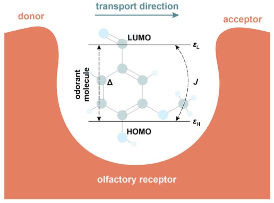 where creates (annihilates) electron with energy at the HOMO/LUMO level and J denotes electronic coupling between considered energy levels. In this framework, the energy gap is simply given as . All these quantities are referred to here as the intrinsic energy scales of the odorant. As a result, they represent exclusively molecular properties of the odorant itself, with no receptor electronic states included. This choice is consistent with previous quantum-mechanical models of olfaction, in which the internal energy scales of odorants are treated as among the dominant factors governing tunneling and inelastic excitation pathways [26,30,49]. The corresponding schematic representation of the odorant molecule is presented in Figure 3.