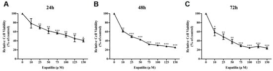 To investigate cell viability, it was measured using the EZ-3000 assay kit (DoGENBIO, Seoul, Republic of Korea). YD-10B cells were seeded at 2 × 104 cells per well in a 96-well plate and cultured for 12 h. Then, eupatilin was treated at concentrations of 10, 25, 50, 75, 100, 125, and 150 μM. The cells were cultured in an incubator at 37 °C and 5% CO2 for 24, 48, and 72 h. After that, 10 μL/well of MTS solution was added to the cell culture medium and reacted in an incubator at 37 °C for 1 h. The absorbance was measured at 450 nm using a microplate reader (Molecular Devices, Sunnydale, CA, USA).