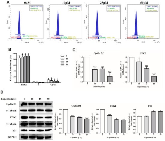 Cell cycle analysis of eupatilin on YD-10B cells. (A) Cell cycle distribution was analyzed by flow cytometry after treatment with various concentrations of eupatilin (0–50 μM) for 48 h. Histograms showed the proportion of cells in the G0/G1, S, and G2/M phases. The box in panel A indicates the cell cycle phase distribution (%). (B) Quantitative analysis was performed to determine the percentage of cells in each phase of the cell cycle after eupatilin treatment. (C) mRNA expression levels of Cyclin D1 and CDK2 were determined by RT-qPCR analysis. (D) Protein expression levels of Cyclin D1, CDK2, and p21 were examined by Western blot analysis. γ-Tubulin and GAPDH were used as loading controls. Relative band intensities were quantified using ImageJ (version 1.54g) software. Data represent the mean ± SD of three independent experiments (*; p < 0.05, **; p < 0.01, ***; p < 0.001 compared with untreated control).