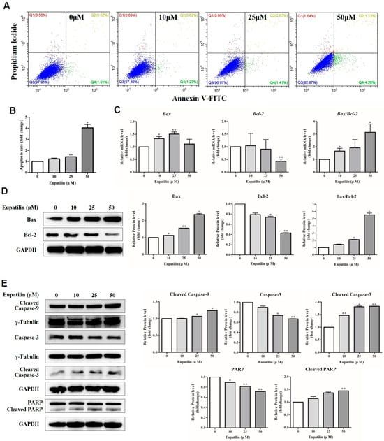 Effect of eupatilin on apoptosis in YD-10B cells. (A) Apoptotic cell death was analyzed using Annexin V-FITC/Propidium iodide (PI) double staining and flow cytometry after treatment with eupatilin (0–50 μM) for 48 h. The percentage of Annexin V-positive cells indicates apoptotic populations. (B) Quantification of apoptotic cells based on flow cytometric analysis. (C) mRNA expression levels of Bax and Bcl-2 were determined by RT-qPCR, and the Bax/Bcl-2 ratio was calculated. GAPDH was used as the loading control. (D) Protein expression levels of Bax and Bcl-2 were analyzed by Western blot analysis, and relative band intensities were quantified using ImageJ software. GAPDH was used as the loading control. (E) Expression of apoptosis-related proteins, including cleaved Caspase-9, Caspase-3, cleaved Caspase-3, PARP, and cleaved PARP, was evaluated by Western blot analysis. γ-tubulin and GAPDH were used as internal controls. Data represent the mean ± SD of three independent experiments (*; p < 0.05, **; p < 0.01 compared with untreated control).
