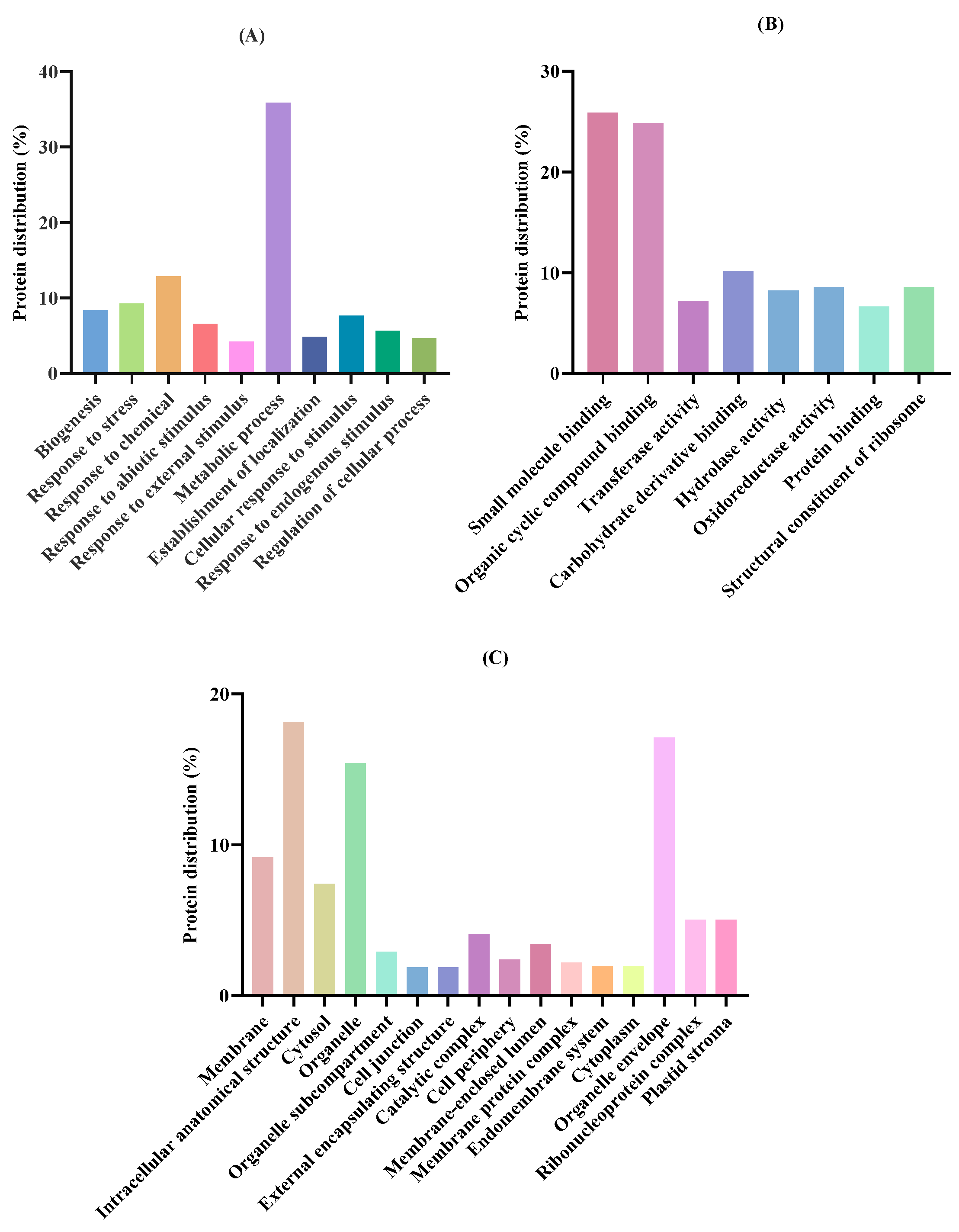 Figure 2. Proteomic functional distribution of identified proteins from Tetraselmis chuii biomass using gene ontology (GO): (A) Biological process GO level 3 distribution; (B) Molecular function GO level 3 distribution; (C) Cellular component GO level 3 distribution. Data are represented in percentages.