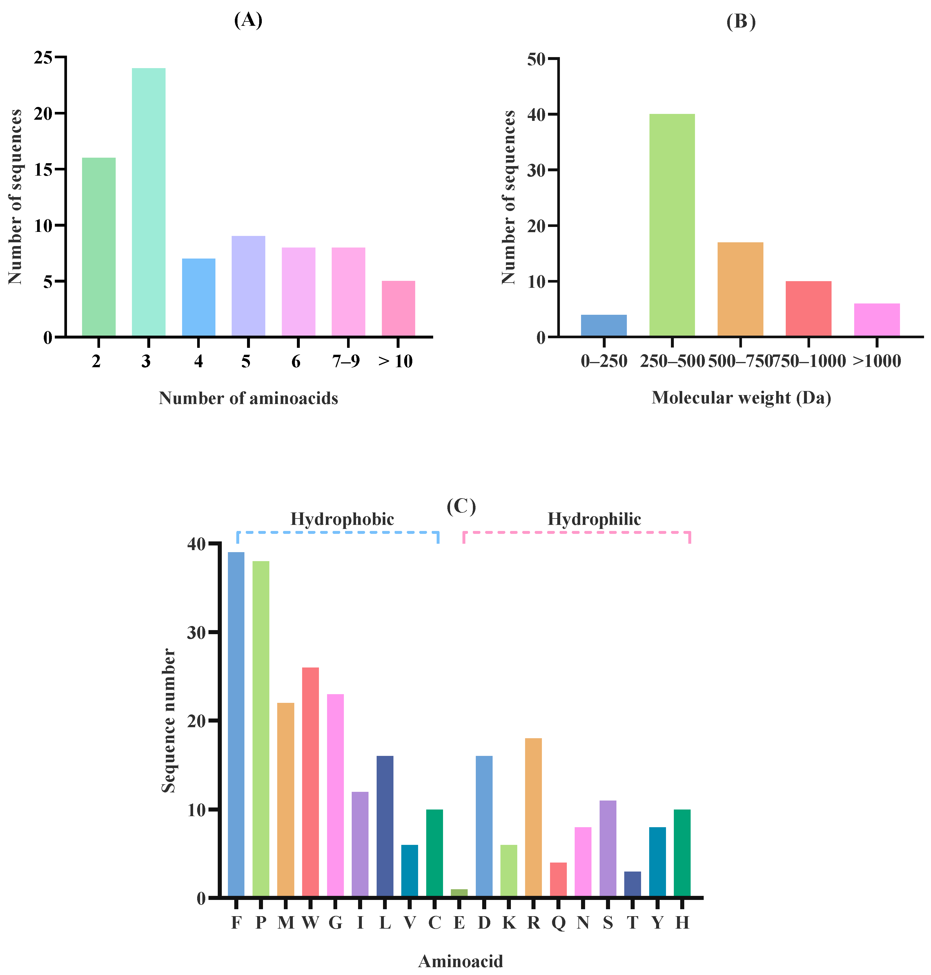 Selected (2083) peptides were classified according to their bioactivity by the Peptide Ranker software http://distilldeep.ucd.ie/PeptideRanker/ (accessed on 3 September 2024). Those peptides with a score ≥ 0.8 (77 peptides) were considered potentially bioactive. Most of the BAPs released after in silico gastric digestion were dipeptides (16) and tripeptides (24) (Figure 3A). Regarding the MW distribution (Figure 3B), peptides in the 250–500 Da range (40 peptides) and the 500–750 Da range (17 peptides) were the most prominent. Low-MW peptides, in general, have been associated with higher antioxidant capacity compared to high-MW peptides [40]. In addition, due to their small size, these peptides have a higher chance of crossing the intestinal barrier and reaching target organs to perform biological functions [41]. The main AAs were phenylalanine (F), proline (P) and tryptophan (W) (Figure 3C). Some AAs, such as tyrosine (Y), tryptophan (W), methionine (M), lysine (K), cysteine (C), and histidine (H), have been demonstrated to contribute to the antioxidant activity of peptides. While many of these exert direct antioxidant effects through electron donation and free radical neutralization, AAs like histidine (H) and lysine (K) can also exert indirect antioxidant effects by chelating pro-oxidant metal ions, thereby limiting metal-catalyzed oxidative reactions [42]. The neutralization capacity of ABTS radicals is attributed to the indole and benzene rings present in aromatic AAs [43]. In addition, the presence of aromatic rings in the molecule allows for charge stabilization, making ROS stable during the radical scavenging process [44].