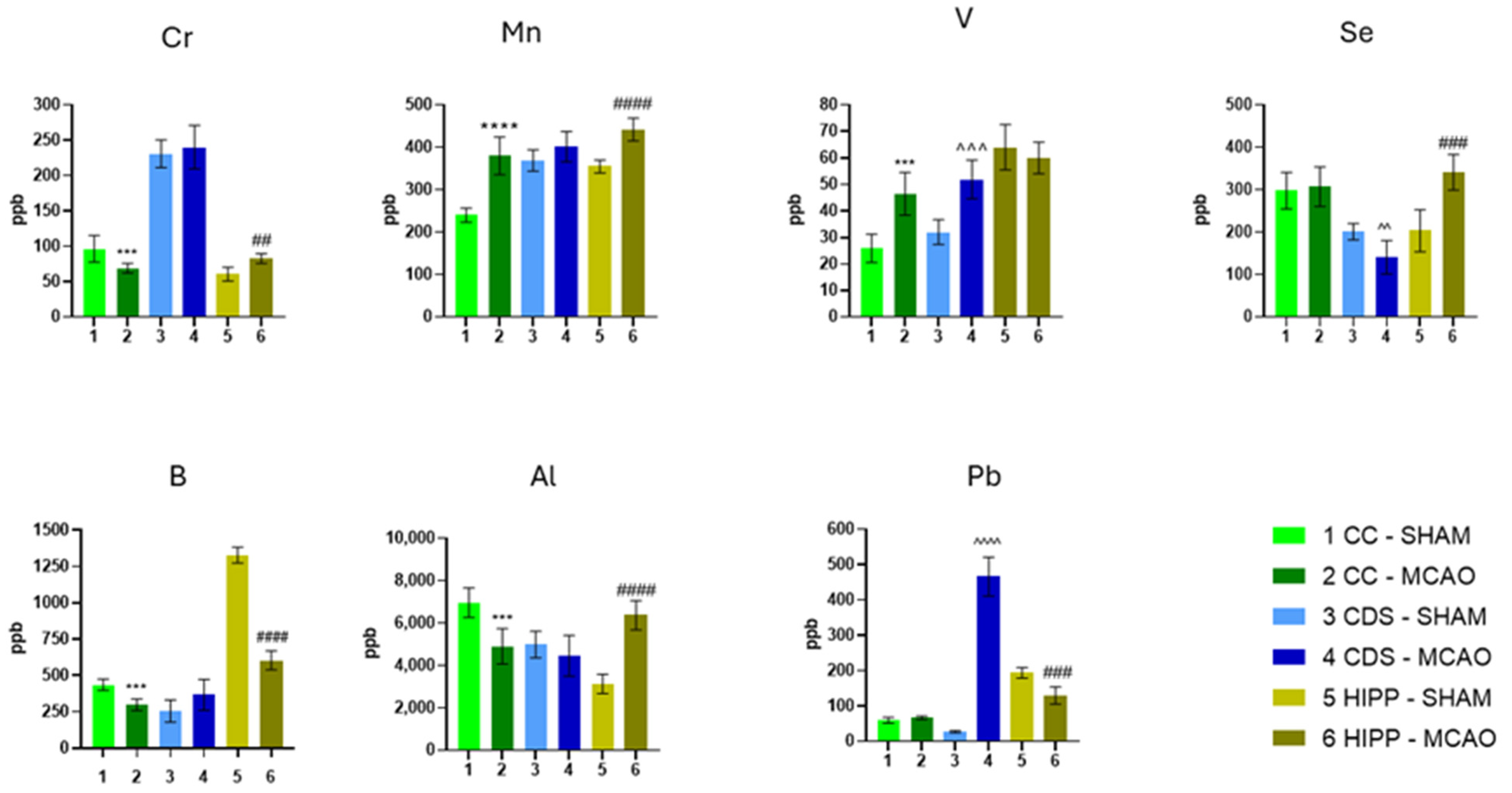 | I. Macroelements | Ca | ↑↑ | ↓↓ | ↑ | Consistent with Ca2+-driven excitotoxicity, mitochondrial dysfunction, and protease activation in ischemic injury. |