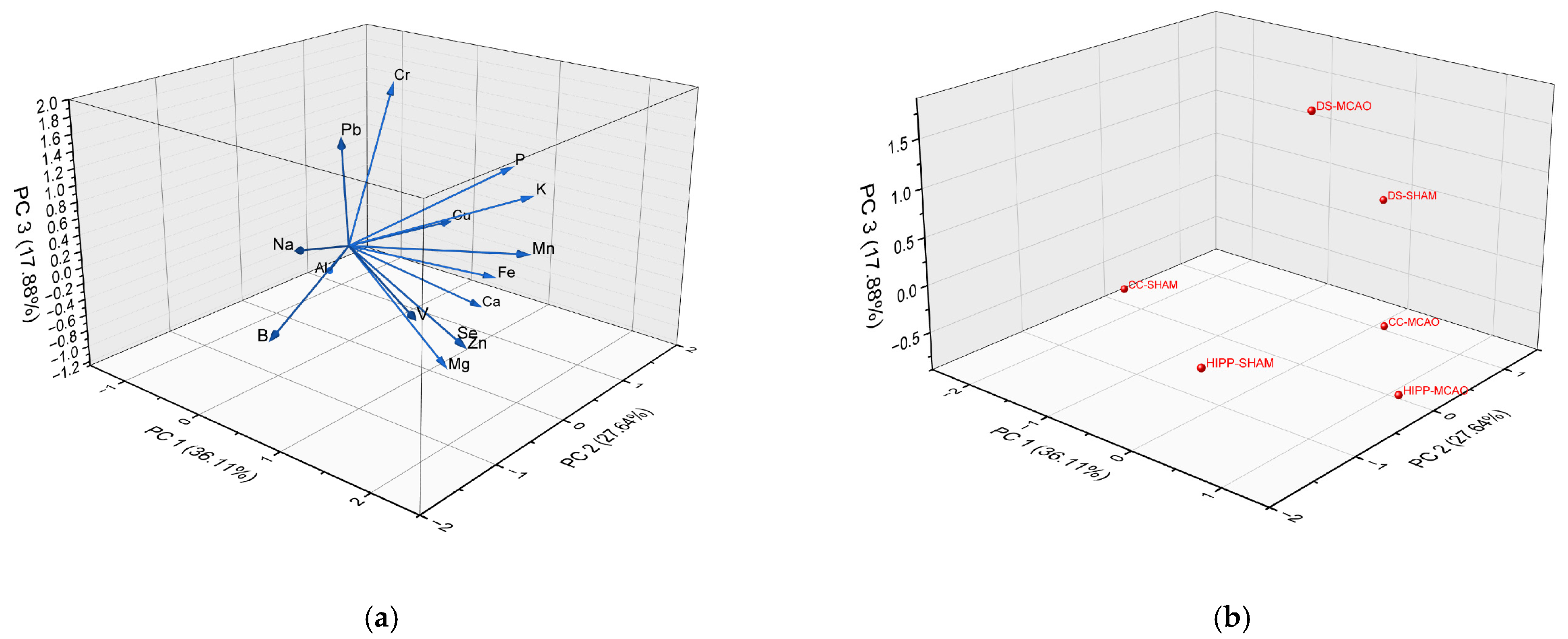 | Element | PC1 36.11% | PC2 27.64% | PC3 17.88% |