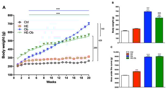 (A) Time course of weight gain (g) of the different experimental conditions during 20 weeks of obesity induction. (B) Weight of the animals under each of the experimental conditions at the end of the induction. (C) Area under the curve of the time courses of each of the conditions. Data are presented as the mean ± SE n = 8. Ctrl group vs. *** = p < 0.001, HE group vs. +++ = p < 0.001, Ob-Veh group vs. &&& = p < 0.001. Post hoc Tukey.