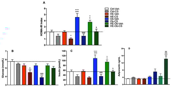 Determinations of (A) HOMA-IR index, (B) Glucose, (C) Insulin, and (D) Serum adiponectin at the end of treatment (0.9 g/Kg) for four weeks, administered with nine-day chickpea sprout flour (CS). Data are presented as the mean (n = 8) ± S.E. Ctrl-Veh group vs. * = p < 0.05, *** = p < 0.001, HE-Veh group vs. + = p < 0.05, +++ = p < 0.001, Ob-Veh vs. &&& = p < 0.001, HE-Ob-Veh vs. $ = p < 0.05, $$$ = p < 0.001. Post hoc Tukey.