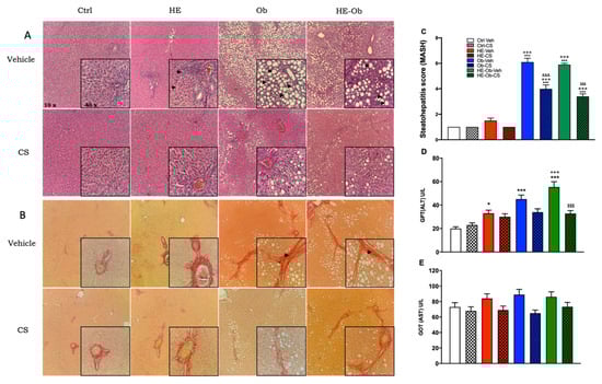 Figure 6A,B show the data from the evaluation of liver tissue, which indicate the degree of steatohepatitis associated with metabolic dysfunction (MASH, Figure 6C). The serum levels of liver enzymes ALT (GPT, Figure 6D) and AST (GOT, Figure 6E) are also presented as markers of hepatocellular damage. Histological analysis revealed that the Ctrl-Veh and Ctrl-CS groups had a healthy liver (MASH = 1). The HE-Veh group exhibited sinusoidal congestion and mild portal inflammation (MASH = 1.5), as biochemically reflected by a moderate increase in ALT and GOT. In contrast, the Ob-Veh and HE-Ob-Veh groups developed severe MASH, with scores of 6.1 and 5.9, respectively. Macro vesicular steatosis, balloon hepatocytes, sinusoidal compression, and the appearance of pericellular fibrosis histologically characterized this condition. This structural damage correlated with higher serum levels of ALT and GOT, indicating significant necroinflammation and hepatocellular damage.