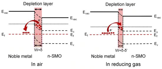 Noble metals, e.g., platinum (Pt), act as an important enhancement of the sensing properties of metal oxide semiconductor (MOS) sensors via the electronic sensitization effect [40,41]. This effect originates from the disparity in work function between the noble metal and the MOS; noble metals typically exhibit a higher work function (>5.0 eV) than n-type MOS materials (e.g., ZnO at approximately 4.2 eV), which leads to spontaneous electron transfer at the interface. Movement of electrons occurs as Fermi levels of the MOS-noble metal are matched until a Schottky barrier is created [42,43], and the electron depletion layer on the MOS surface is significantly increased [44] (Figure 2).