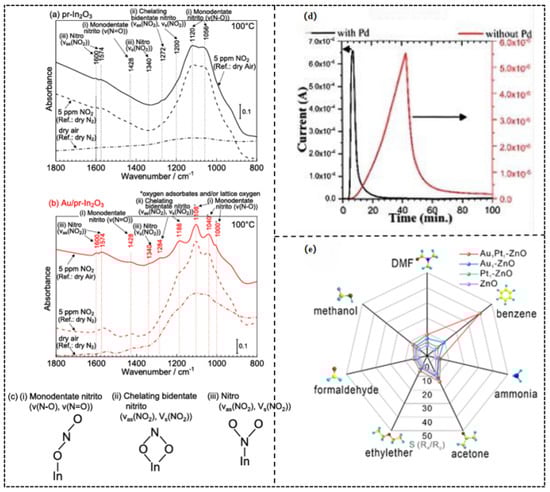In a study by Taro Ueda et al. [50], in situ diffuse reflectance infrared Fourier transform spectroscopy (DRIFTS) analysis (Figure 6a–c) of porous In2O3 loaded with Au nanoparticles (0.5 wt%) revealed that Au significantly enhanced the chemical adsorption activity and the quantity of NO2 on the material surface. Au catalyzed the formation of more highly reactive adsorbed species at the interface, such as monodentate nitrite (characteristic IR peak at ~1108 cm−1) and chelating bidentate nitrite (peaks at ~1284 cm−1 and ~1188 cm−1). The energy barrier of the forming of these negatively charged adsorbed species was also lesser with the presence of Au. This alteration in surface chemistry directly resulted in a notably higher response of the Au/In2O3 sensor to low concentrations of NO (0.6–5 ppm) at 100 °C compared to pure In2O3 (Figure 6d), along with faster response/recovery kinetics. The fundamental nature of chemical sensitization, as is evident in this case, is that noble metal catalysts can increase reaction rates and selectivity, by decreasing the activation energy of important surface reaction steps (e.g., gas dissociation, oxygen activation, and intermediate formation), controlling reaction pathways, and, in the end, yielding high sensitivity and rapid-response gas sensing behavior.