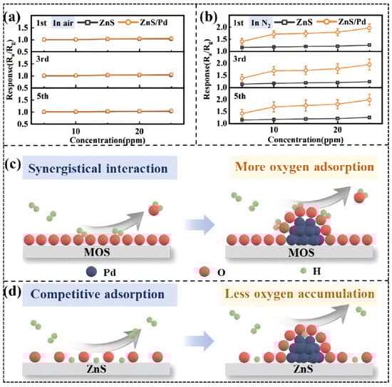 A fundamental aspect of electronic sensitization is that it does not scale the resistance under air (Rair) and gas (Rgas) environments equally. Instead, its primary action is to profoundly alter the initial electronic state by depleting the MOS of charge carriers, thereby establishing a very high Rair. When a reducing gas is introduced, the ensuing surface reactions reduce the height of the pre-existing Schottky barrier. Crucially, this barrier modulation effect means that the relative resistance change (ΔR/Rair) for a given quantity of released electrons is amplified. Although Rgas for the decorated sensor may also be higher than that of its pristine counterpart, the increase in Rair is disproportionately larger. This disproportionate increase is quantitatively reflected in the sensor response (for an n-type MOS to reducing gases, S = Rair/Rgas − 1), leading to a greater Rair/Rgas ratio and thus enhanced sensitivity.