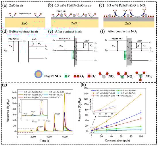 - Sui, C.; Zhang, M.; Li, Y.; Wang, Y.; Liu, Y.; Liu, Z.; Bai, J.; Liu, F.; Lu, G. Pd@Pt Core-Shell Nanocrystal-Decorated ZnO Nanosheets for ppt-Level NO2 Detection. ACS Sens. 2024, 9, 1967–1977. [Google Scholar] [CrossRef] [PubMed]