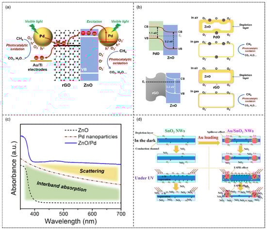 As such, to overcome these drawbacks, researchers have examined a wide range of strategies, including optimization of the morphology and microstructure of metal oxides (e.g., the creation of nanomaterials and porous materials) [13,14,15], building heterojunctions between metal oxides [16,17,18], elemental doping [19], and functionalizing surfaces [20]. Notably, the deployment of noble metal nanoparticles—including Au, Pt, Pd, Ag, Rh, and Ru (Table 1)—has proven to be a highly promising route for the enhancement of SMO gas sensors, yielding multifarious and significant benefits to their sensing capabilities. The affinity of the noble metals enables adsorption, dissociation and surface reaction of target gas molecules which in turn makes the sensor more sensitive and have, for example, faster reaction/recovery dynamics. Moreover, electronic sensitization effects (e.g., formation of Schottky barriers at the noble metal–metal oxide interface) effectively control charge transfer and enhance resistance variations by gas interactions [5,21,22,23]. The chemical sensitization effect is especially significant, allowing specific noble metals (e.g., Pd with H2, Au with H2S) [24] to create selective bonds or a strong adsorbent with the particular target gases [25,26]; therefore, high sensor selectivity is significantly enhanced. Moreover, in the photo-assisted gas sensors, the surface plasmon resonance (SPR) effect of noble metals such as Au and Ag can significantly improve light absorption [27,28], which gives a significant argument to the promotion of the work of light-driven gas sensing.