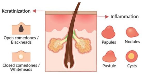 Acne is a chronic inflammatory dermatosis of the pilosebaceous unit, historically associated with Propionibacterium acnes (now Cutibacterium acnes), and characterised by non-inflammatory lesions such as open comedones, more commonly called blackheads, and closed comedones or whiteheads and inflammatory lesions like papules, pustules, nodules, and cysts (Figure 2) [89,90]. The condition involves altered bacterial colonisation within follicles, but pathogenesis is multifactorial. Notably, C. acnes is abundant in the microbiota of most adults; however, only a subset develop acne, indicating that strain-level differences, host factors, and micro environmental context modulate pathogenicity. Transcriptional profiles of C. acnes also differ between healthy and acne skin, supporting a functional rather than purely abundance-based shift [5,22,33,87,91,92,93,94,95,96].