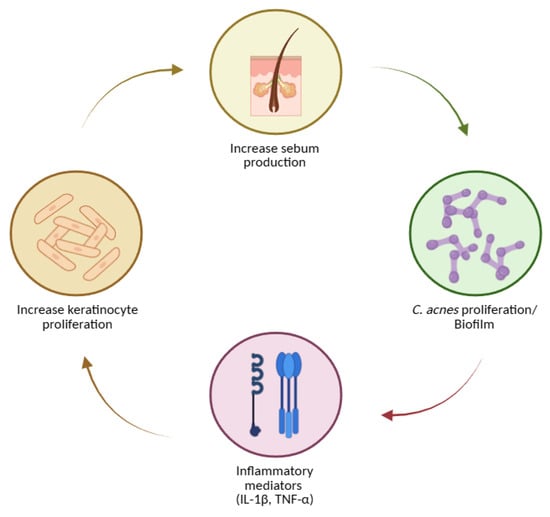 These processes can be envisioned as a self-reinforcing loop (Figure 3): hyperkeratinisation and altered sebum favour C. acnes growth and biofilms; bacterial products intensify inflammation; inflammatory mediators (including IL-1) further dysregulate keratinisation and sebaceous function [128,129,130,136,137,141,142,145,148].
