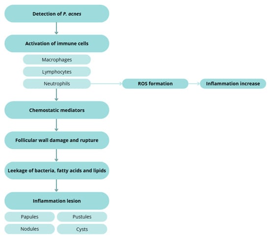 Host detection of C. acnes triggers macrophage, lymphocyte, and neutrophil activation. Chemotactic factors and ROS generation contribute to follicular wall damage and rupture with extrusion of keratin, lipids, and bacteria into the dermis, producing papules, pustules, nodules, and cysts [123,131,132,145,156,157].