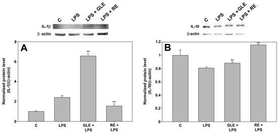 Effect of co-treatment with 0.1 μg/mL LPS and 10 μg/mL GLE or 0.1 μg/mL RE on IL-1β (A) and IL-10 (B) protein levels in RAW 264.7 cells, determined by Western blot. Each bar is representative of at least three independent experiments performed in triplicate. Values are expressed as mean fold change ± s.e.m. compared to the control (C). One-way ANOVA followed by Holm–Sidak comparison procedure was used. ** p < 0.001 vs. LPS. Normality test vs. control passed.