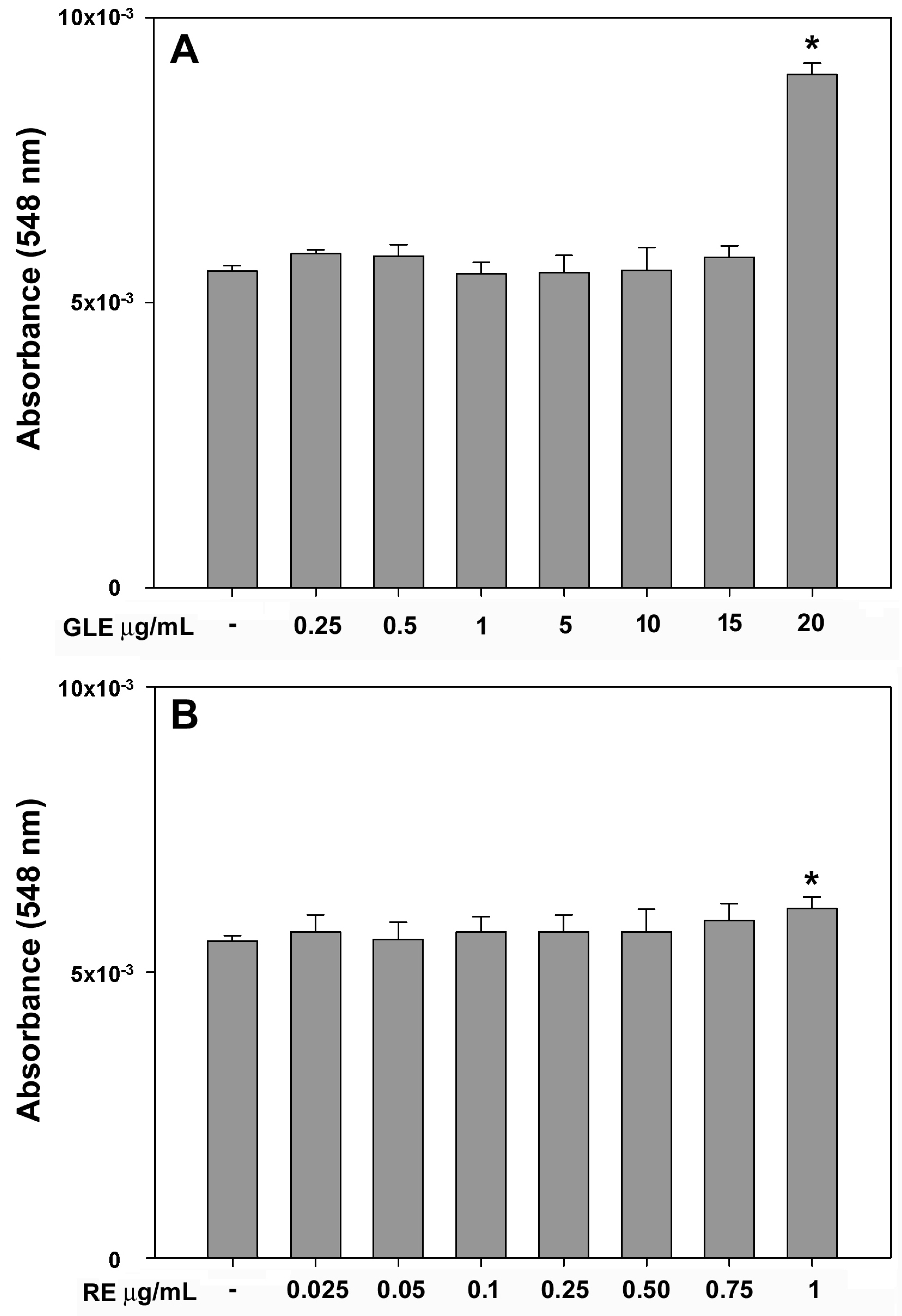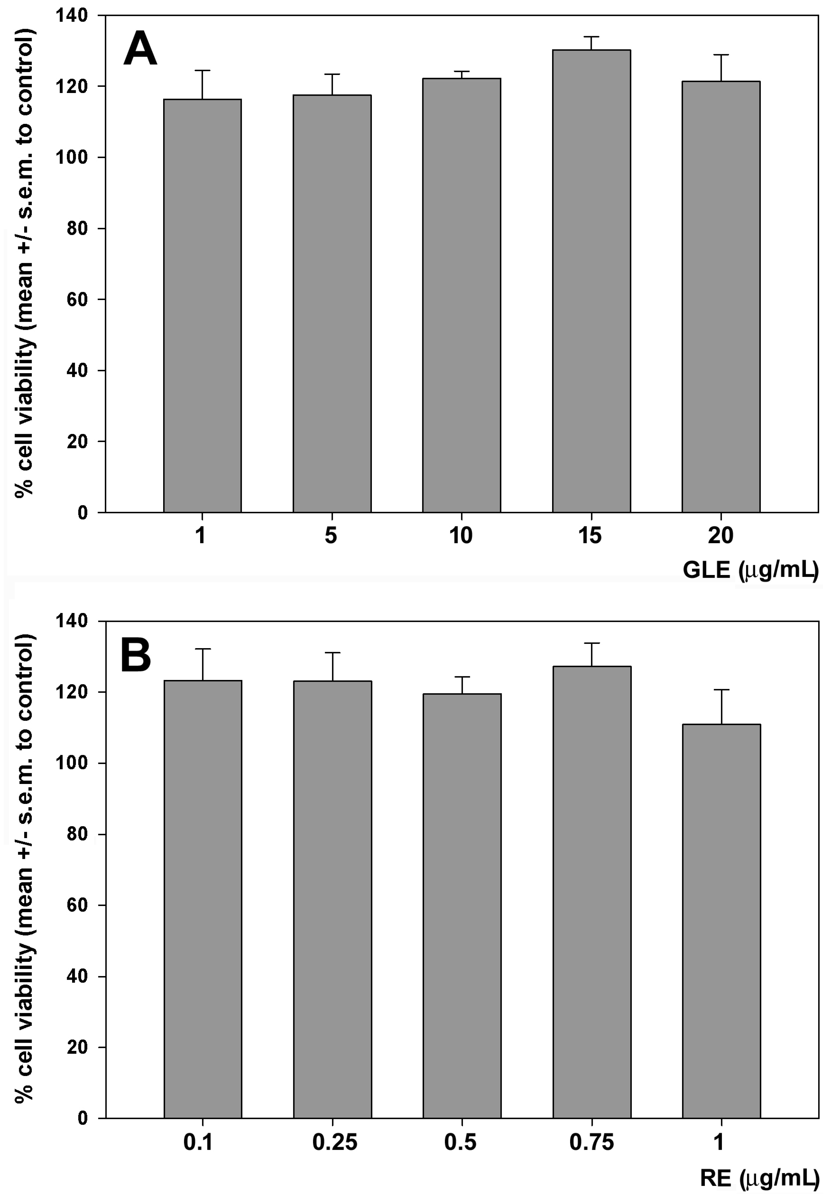 2.1. Effects of GLE and RE on the Viability and NO Production in RAW 264.7 Cells Cultured in Control Conditions