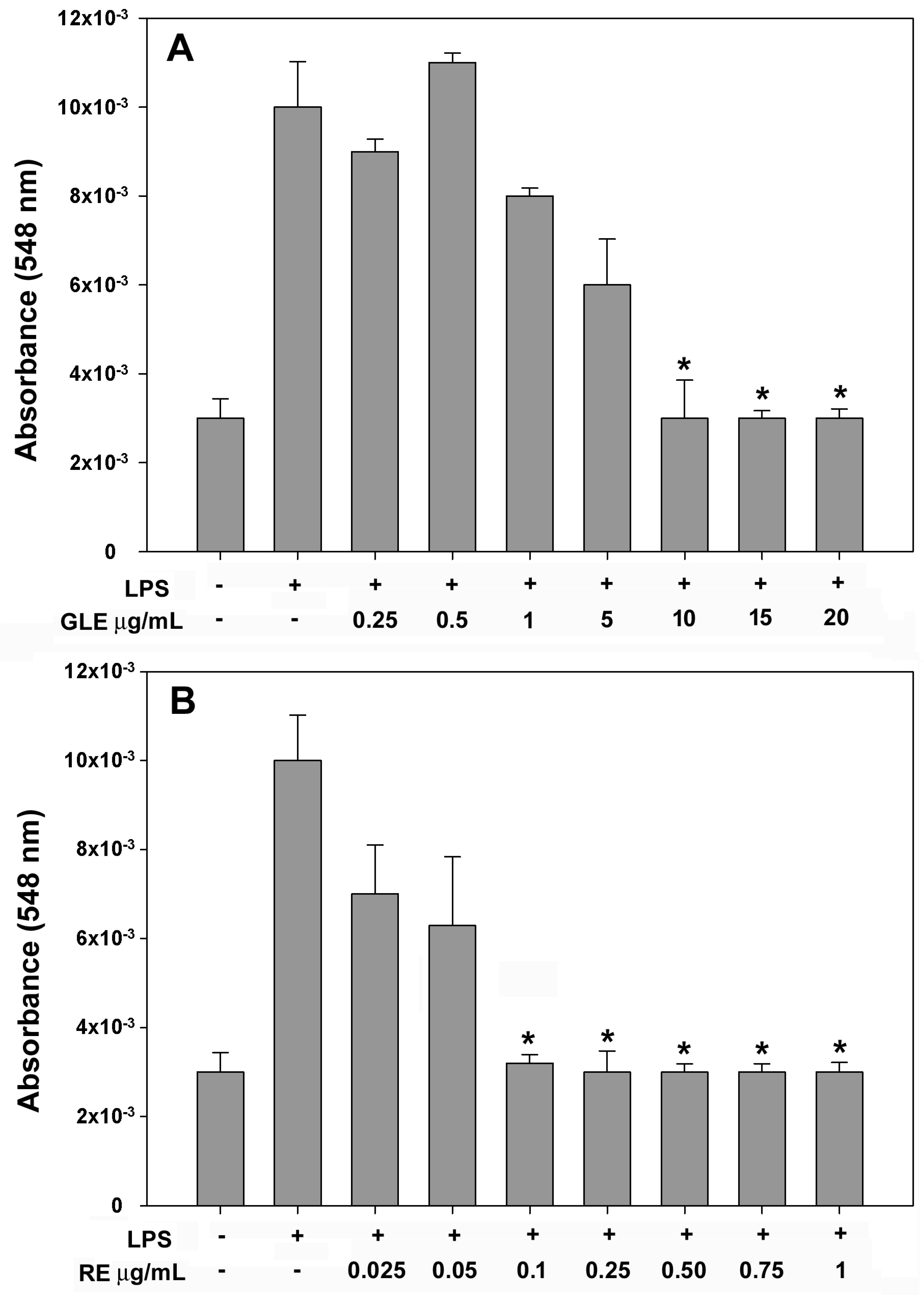 2.2. Effects of GLE and RE on NO Production and iNOS mRNA Expression Level in LPS-Treated RAW 264.7 Cells