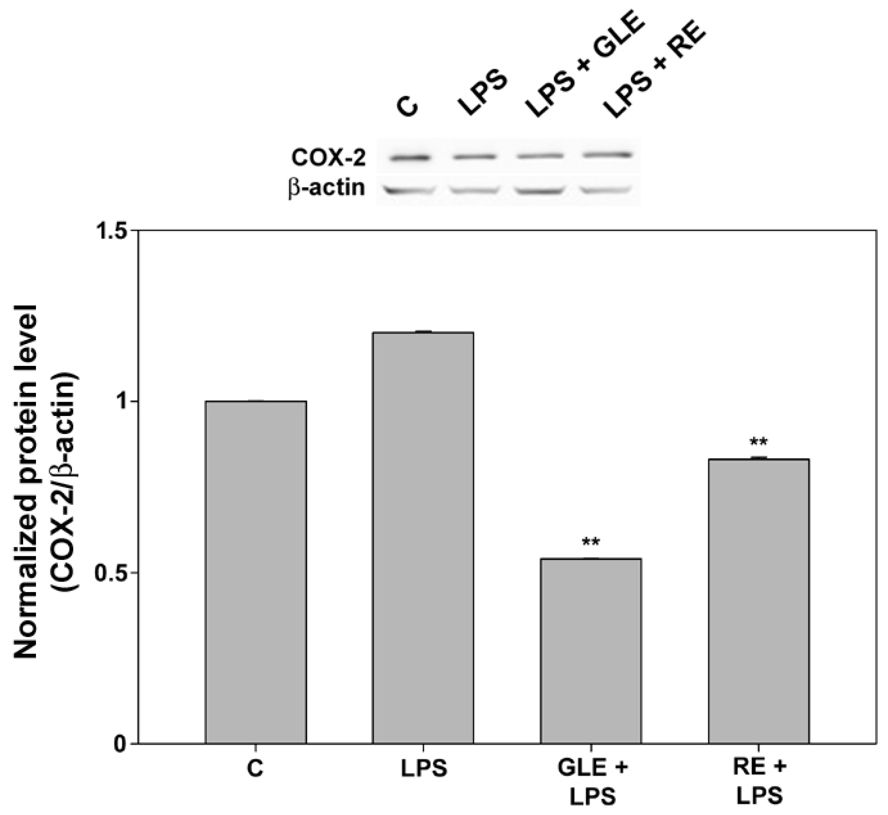 2.3. Effects of GLE and RE on Cyclooxygenase-2 (COX-2) mRNA Expression and Protein Levels in LPS-Treated RAW 264.7 Cells