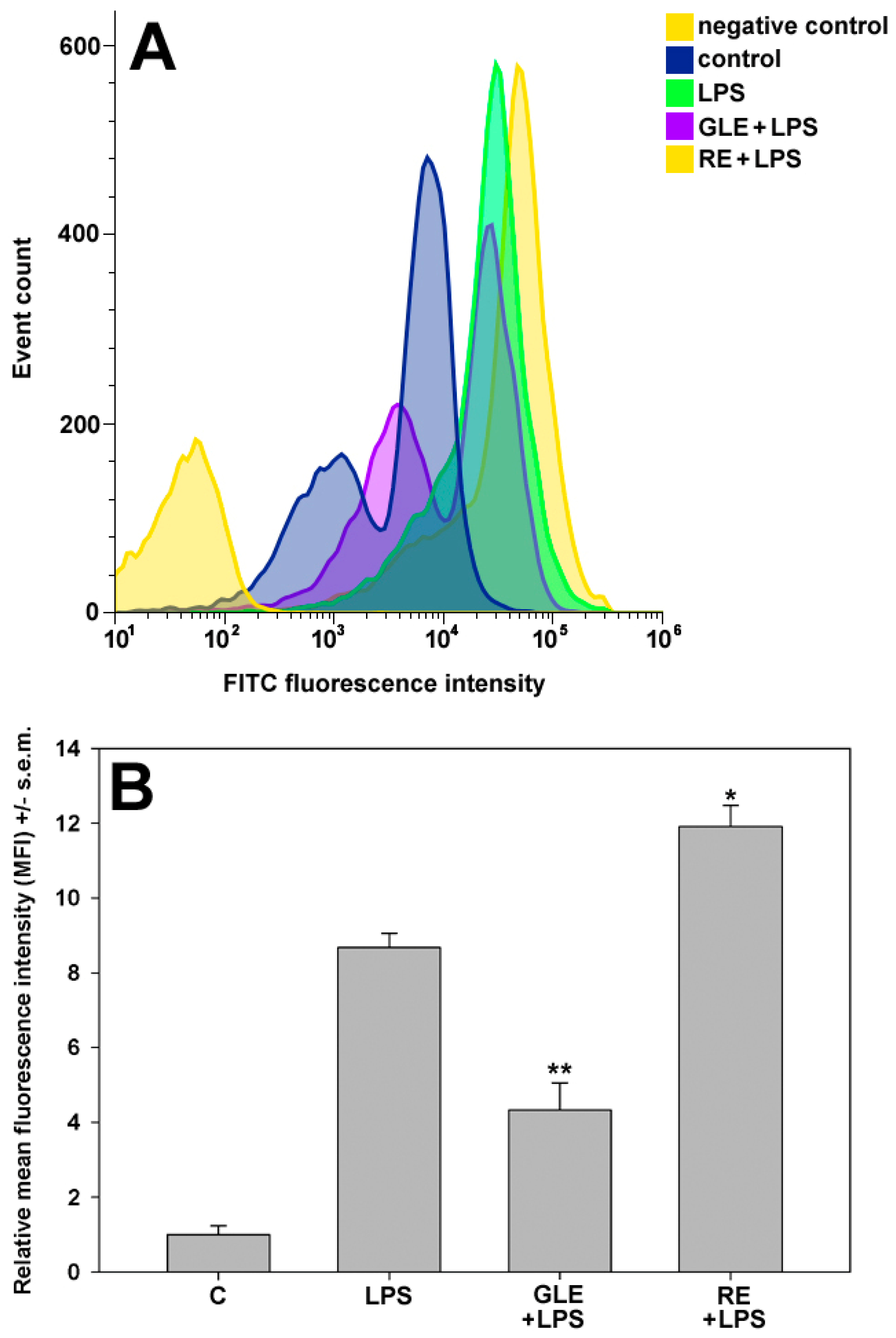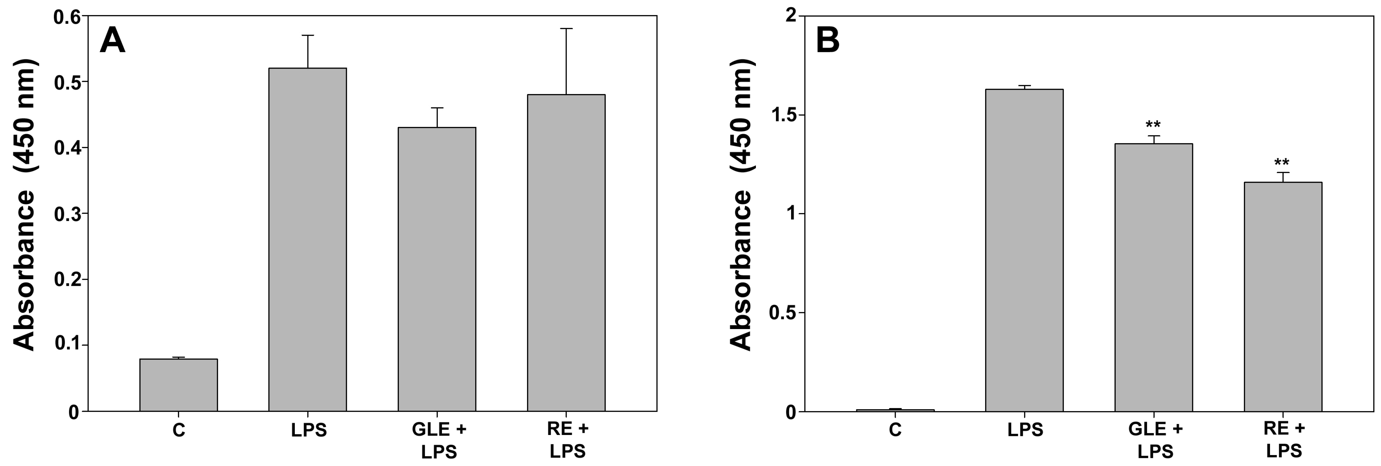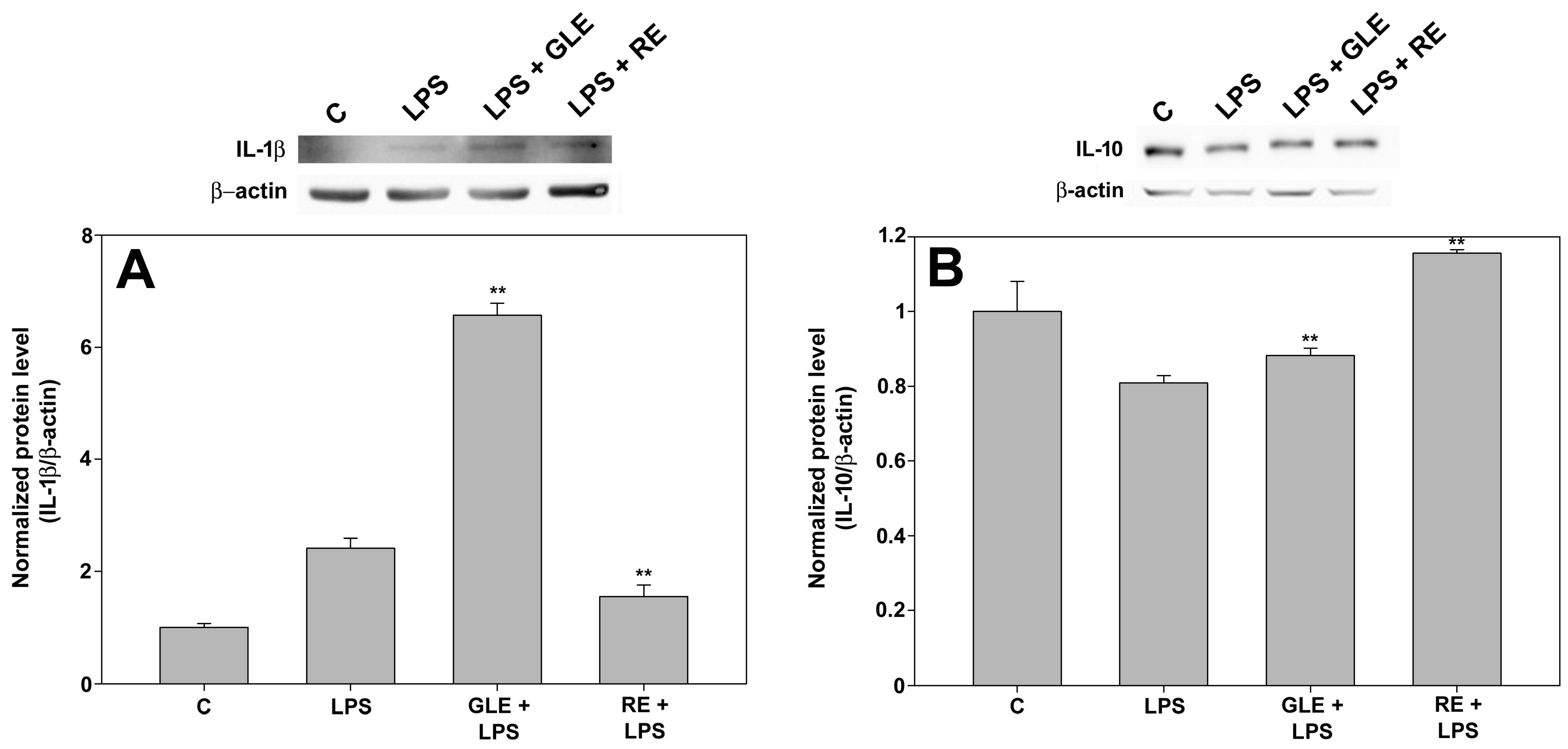 2.7. Effect of GLE and RE on the Bulk-Phase Endocytic Acyivity of LPS-Treated RAW 264.7 Cells