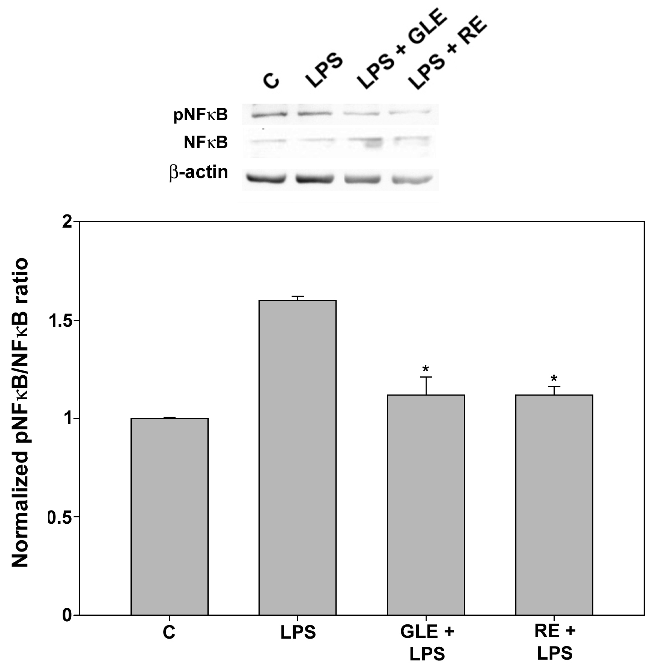 2.5. Effects of GLE and RE on NF-κB p105 mRNA Expression Level and NF-κB Activation in LPS-Treated RAW 264.7 Cells