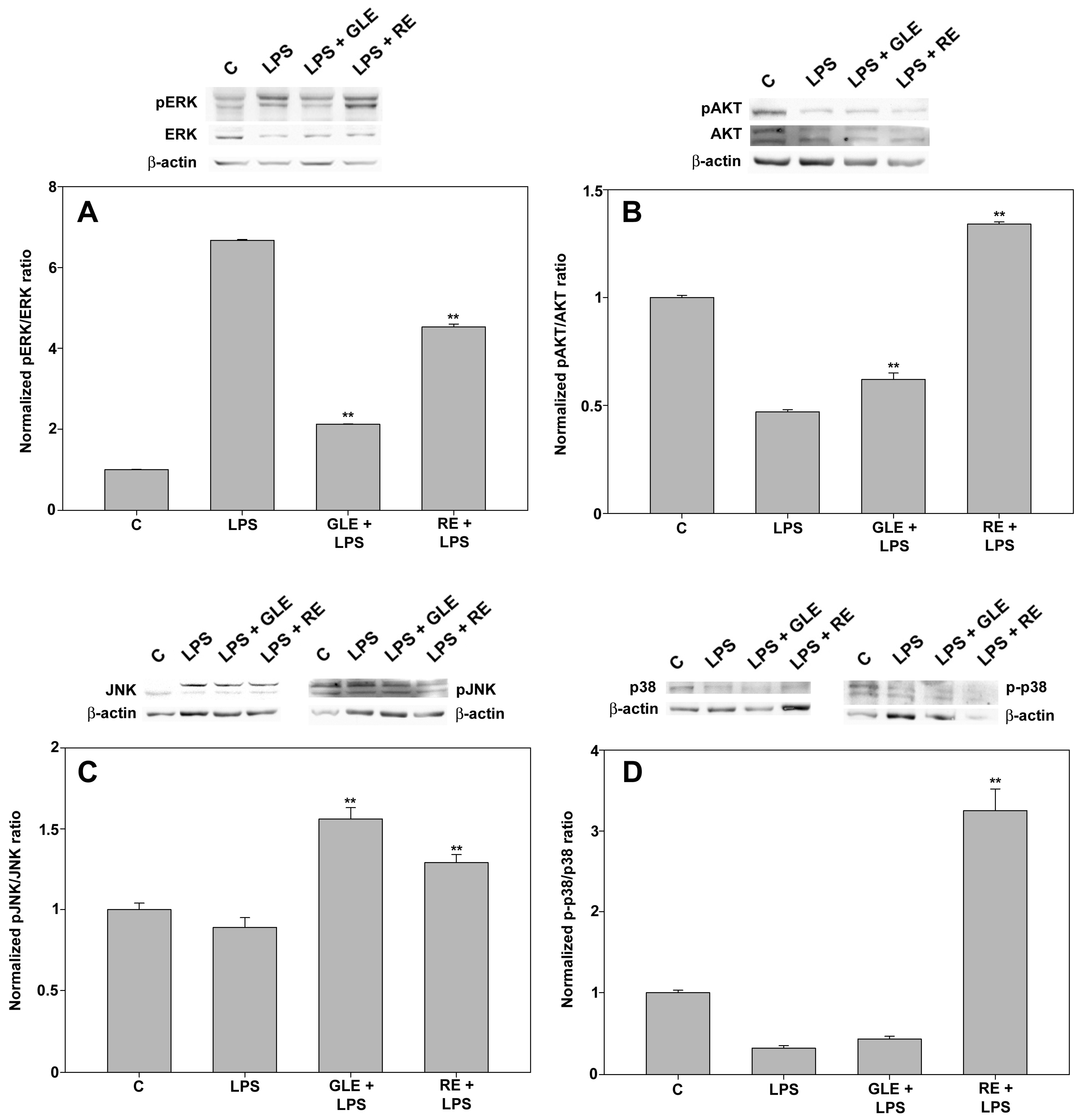 2.6. Effects of GLE and RE on the Activation of Signaling Pathways in LPS-Treated RAW 264.7 Cells