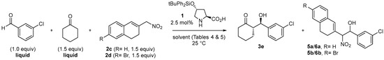 Table 4 provides an overview of the competition reactions between nitro compound 2d and cyclohexanone (Scheme 3) in a variety of solvents. Four reactions were deemed unfair due to a lack of full solubility of 2d even at t = 1 h (Table 4, entries 1, 2, 4, and 7). By contrast, anhydrous DMSO (entry 3) provided a homogenous solution, but an unknown as the major product, resulting in an estimated total yield of 45% for the unknown product, aldol products, and Henry products in an approximate ratio of 4:3:1. The unidentified compound appears to incorporate two molecules of 2d and one molecule of 3-chlorobenzaldehyde; see Supplementary Materials Section S10 for 1H and 13C NMR and HRMS data. Use of EtOH (0.5 M) resulted in homogeneous reactions, but even with elevated catalyst loadings of 20 or 5 mol% (Table 4, entries 5 and 6), significant quantities of the limiting reactant, 3-chlorobenzaldehyde, remained unreacted, and the dr and ee were suppressed.