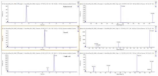 Extracted ion chromatograms (XICs) and MS/MS spectra of hydroxytyrosol, tyrosol, and vanillic acid (SCIEX 6600+ LC-QTOF) of polyphenolic extract (PPE).