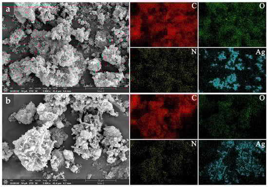The EDS elemental maps confirm the presence and distribution of carbon (C), oxygen (O), nitrogen (N), and silver (Ag) within the analyzed composites. The nitrogen signal, originating solely from polyaniline, is uniformly distributed across the entire mapped area of both samples, indicating the successful formation of a continuous PANI coating over the conductive filler network.