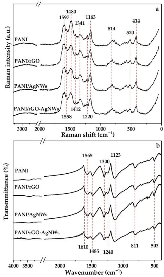 Raman (a) and FTIR (b) spectra of neat PANI and its nanocomposites: PANI/rGO, PANI/AgNWs, and PANI/rGO–AgNWs.