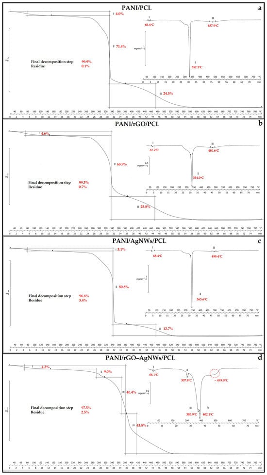 The quaternary PANI/rGO–AgNWs/PCL system (Figure 5d) exhibited the most complex decomposition profile, with four distinct stages. The initial minor event at 66 °C (≈4.3%) is due to moisture release; the second at 307.8 °C (≈9.0%) corresponds to the oxidation of low-molecular-weight segments; the third (≈40.4%) and fourth (≈43.8%) stages at 385.9 °C and 402.1 °C represent overlapping degradation of the PANI backbone and the PCL matrix. The final residue increased to 2.5%, indicating the synergistic stabilization provided by the dual rGO–AgNWs hybrid network [47,53]. The conductive framework serves as both a physical barrier and a heat-dissipation pathway, slowing oxidative decomposition and promoting char formation.